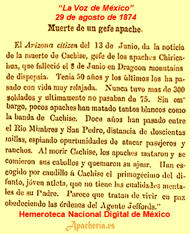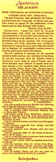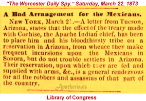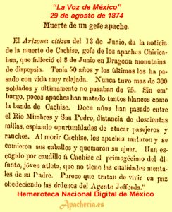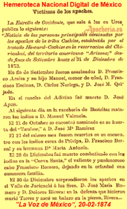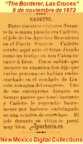 “Las Vegas Gazette”, se hace eco de un artículo del periódico “El Fronterizo”, titulado: “Los apaches. Los apaches reportados la semana pasada como habiendo ahuyentado el ganado del rancho de San Agustín, pasaron por el cañón de la Soledad y cruzaron el río abajo La Unión. Después de llegar a este lado de la sierra, se habían separado en diferentes partidas para el objeto de juntar ganado. Dos fueron vistos en el ganado, de caballos de Frank Azcarate pero el pastor los corrió y salvo el ganado cerca del Chamberino, varios caballos fueron robados abajo en Amoles y de La Unión varios más. Dos mexicanos, quienes vieron algunos apaches viniendo hacia ellos, se escondieron cuando los apaches habían pasado; los mexicanos tiraron algunos balazos y los indios corrieron dejando algunos caballos; estos fueron asegurados y dados a las autoridades en El Paso. El Sr. Wood y el Sr. Lapoint han ido allá para ver si los caballos de ellos están con los otros. Está supuesto que el Sr. Reed, con Chacón y varios otros, están todavía en perseguimiento para determinar [?] de qué reservación son los apaches. El Fronterizo”.