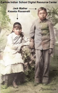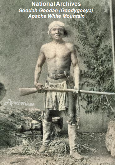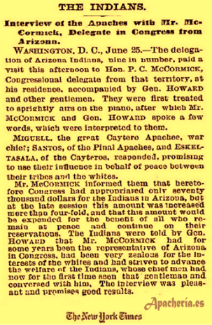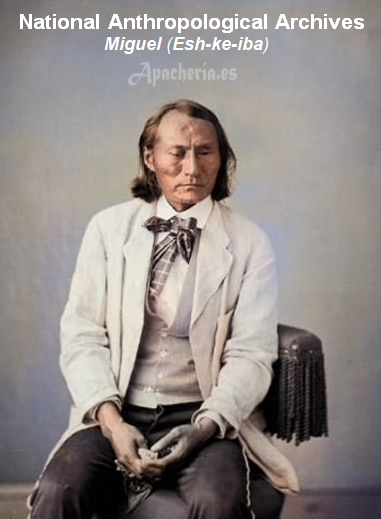 White Mountain. Más tarde, viajó con una delegación a Washington formada por dos pimas [Luis y Antoñito]; un pápago [Ascensión Ríos]; dos yavapais de Date Creek [Pakota {más tarde llamado José Coffee} y su sobrino Takodawa {más tarde llamado Washington Charley}]; un apache aravaipa [Santos]; y tres Western Apaches [Miguel o Esh-ke-iba, Pedro o Hack-yaniltl-i-dn, y Eskeltecela o Esh-kel-dah-silah]; más un intérprete de apache, Concepción, un antiguo cautivo mexicano que vivió con los apaches; un profesor de los pimas, el reverendo Charles H. Cook; el nuevo comisionado de Asuntos Indios, Edward P. Smith; el Superintendente territorial de Asuntos Indios, el comandante Herman Bendell; y los conductores de los carros y los soldados de escolta al mando del capitán Melville Cary Wilkinson. Viajaron hasta Santa Fe [Santa Fe County, New Mexico] donde cogieron un tren hasta Washington D.C., llegando el 20 de junio.