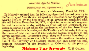 sus tropas están en guerra contra los apaches en Arizona. Algunos resisten, pero la mayoría permanecen pacíficamente en las reservas, aunque las condiciones de estas sean muy malas. El Departamento de Guerra y el Departamento de Interior compiten por el control de los apaches. Un número creciente de ciudadanos estadounidenses de origen europeo se trasladan al Suroeste instalándose permanentemente en el territorio.