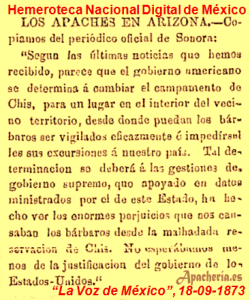 de la Reserva Chiricahua ([Cochise County, Arizona]. Una partida de guerra de unos 40 chiricahuas salió de la reserva para ir a Fronteras [Sonora], poco después de que el agente Tom Jeffords les diera las raciones. Probablemente Chihuahua dirigía el grupo que llevaba 40 chihennes de Ojo Caliente [Socorro County, New Mexico].