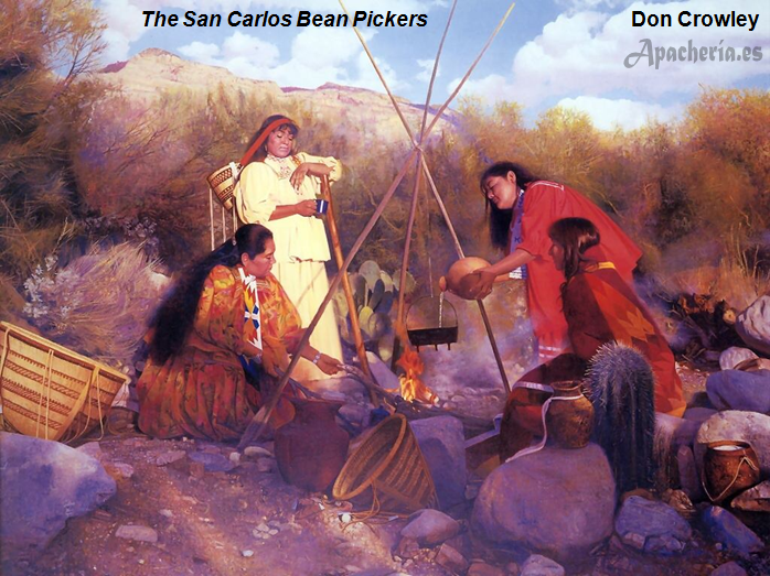 . Entonces plantaron, estuvieron en paz y no siguieron el sendero de la guerra. Cuando venían los Tontos Apaches, los combatían y los rechazaban, y volvían a sembrar maíz y otros cultivos. Luego cazaron ciervos y otros animales, despojaron y secaron la carne para comer; recogieron maíz y permanecieron en paz. Cuando Santos envejeció, hizo jefe a Eskiminzin. Fue él quien trajo a Santos y a su gente al Cañóna Aravaipa. Santos dijo que era un buen lugar, y que había venido toda la tribu. No habían hecho daño. Eskiminzin nunca comenzó una guerra, ni robó caballos o ganado, ni robó ni mató a personas blancas. Tenían la intención de vivir tranquila y felizmente, pero una noche los hombres hicieron una gran danza. Estaban tan cansados que se fueron a dormir donde habían danzado, mientras las mujeres y los niños lo hicieron a cierta distancia de los hombres. Mientras todos dormían, antes de que saliera el sol, un gran grupo de hombres blancos y mexicanos vino y atacó a las mujeres y los niños [conocida como la “masacre de Camp Grant”].