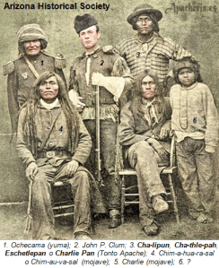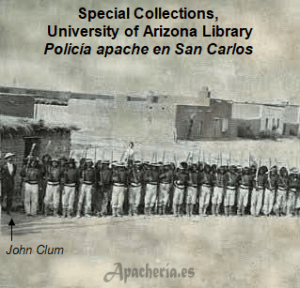Reserva de San Carlos (Gila, Graham & Pinal Counties, Arizona) a petición de su agente John Clum, estando la reserva completamente bajo su control. (Este control no abarcaba a la Reserva de Camp Apache [Navajo County, Arizona]. En noviembre, el gobernador de Arizona, Anson Peacely Killan Safford visitó San Carlos, escuchando de varios jefes que ahora los apaches estaban siendo bien tratados. Si alguien cometía un delito, la policía apache le perseguía. Si el tribunal apache le condenaba, sólo él era castigado en lugar de toda su banda, como ocurría antes. La policía apache patrullaba todos los campamentos nativos, sofocaba disturbios, e informaba de cualquier señal de motín o desorden. Clum también les dio poder para explorar toda la reserva, detener a los nativos ausentes de la Agencia que no tenían pases y aprehender a los blancos que invadiesen la reserva. La policía apache demostró ser tan eficaz que el agente generalmente los enviaba solos a hacer sus rondas. Sin embargo, en agosto había contratado a Clay Beauford, veterano scout, para hacerse cargo de ellos. Los apaches llamaban a Beauford, “Klatch-u-way”, en alusión a sus anchos hombros y caderas. Dado que algunas veces había blancos involucrados, el nombramiento de Beauford resultó acertado porque aseguraba que los colonos respetarían la autoridad de la policía apache.
