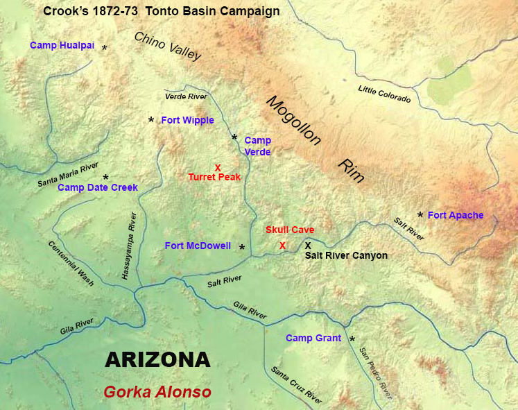 * El 7 de febrero de 1872, el teniente coronel Crook emite su última advertencia a los apaches: “Todos los apaches que se encuentren lejos de sus reservas a partir del día 16, solo podrán regresar como prisioneros de guerra”. (Pero el 20 de febrero, el secretario de Interior, Columbus Delano avisó a los generales Schofield y Sheridan que evitasen las hostilidades con los apaches tanto como fuera posible para conseguir que se trasladasen a las reservas).