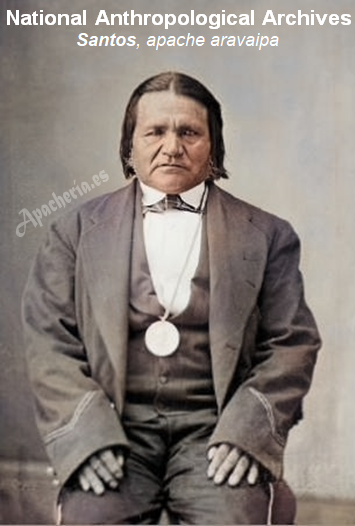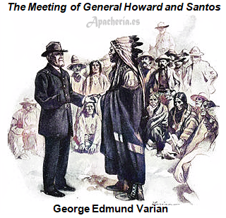 llamaría Fort Grant, trasladándose al Graham County, Arizona]. En la Agencia había un mexicano de unos 25 años llamado Concepción, que hablaba apache, ya que había sido capturado por los apaches White Mountain. Concepción, al que Howard utilizó como intérprete, dijo que el jefe de los apaches aravaipas era Santos, pero el verdadero líder era su yerno, Hashké Bahnzin, más conocido como Eskiminzin, un Pinal Apache, casado con la hija aravaipa de Santos. Concepción fue en su busca, regresando con los dos jefes en dos horas. Howard diría en su libro “Famous Indian Chiefs I Have Known”: “Santos era un hombre corpulento, de cuello corto, no muy alto, pero con una cabeza bien formada. Su cabello negro y lacio estaba partido en el medio y muy corto, de modo que las puntas apenas tocaban sus hombros. Llevaba un chaleco común sobre una camisa pobre, abierta en la garganta. Llevaba una tira de algodón alrededor de la cintura, como una falda corta, y calzaba unos mocasines bajos de pedrería. Dos sartas de cuentas brillantes colgaban de su cuello”.