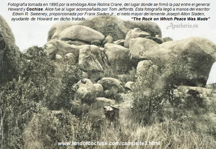 único hombre blanco en quien confiaba Cochise. (Tres días después de su llegada a Fort Tularosa, Howard y Sladen vieron por primera vez a Jeffords cuando llegó al fuerte siendo guía de una compañía de caballería que venía de patrulla. Sladen describió el momento en “Making Peace with Cochise”: “Al lado del oficial al mando iba un ciudadano alto y esbelto, con una larga barba ondulada de tono rojizo, su rostro sombreado por el ala ancha de un sombrero holgado y monótono, pero con un rostro agradable iluminado por un par de ojos brillantes y penetrantes de color azul claro. Miré a este hombre con considerable curiosidad, porque era Jeffords, el hombre que nos llevaría a Cochise, si había alguien que pudiera hacerlo”. La primera conversación que Howard tuvo con Jeffords fue: “Tengo entendido, señor Jeffords, que usted conoce a Cochise y puede encontrarlo. He venido aquí desde Camp Apache para encontrarte y, si es posible, para que vayas a donde él y le convenzas de que venga para una entrevista”.