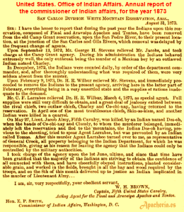firmemente a Clum en una carta a E. P. Smith, Comisionado de Asuntos Indios. (La solicitud del general Schofield de asumir la plena autoridad sobre los nativos de Arizona es rechazada, apoyando “la política de concentración de indios”. William E. Morford es finalmente cesado como agente de Camp Apache [Navajo County, Arizona] convirtiéndose esta reserva en una sub-agencia de San Carlos. La banda de Diablo [Esh-ken-la] fue obligada a trasladarse a San Carlos cuando éste fue licenciado como scout del ejército. En cambio a la banda de Pedro [Hack-yaniltl-i-dn] se le permitió permanecer en Camp Apache, lo que creó animosidad entre los dos jefes).