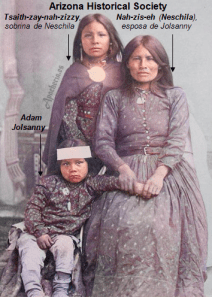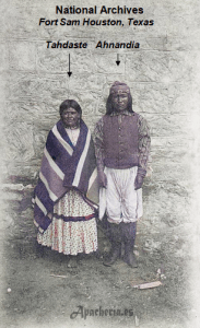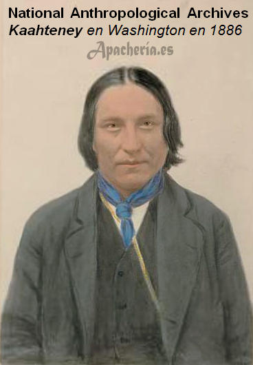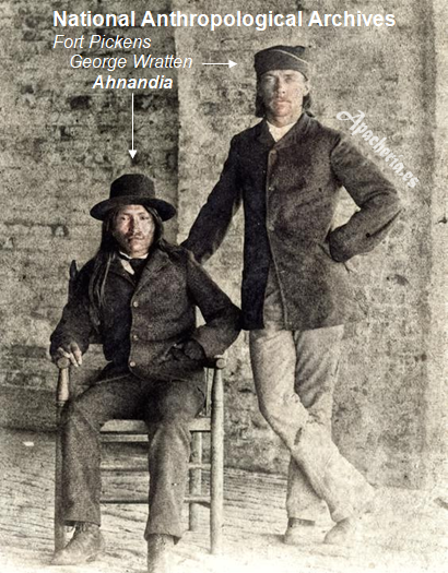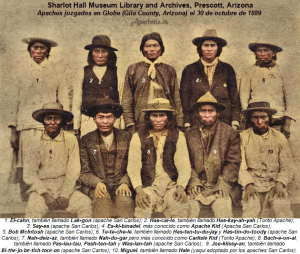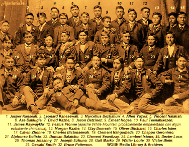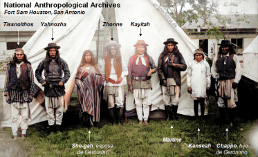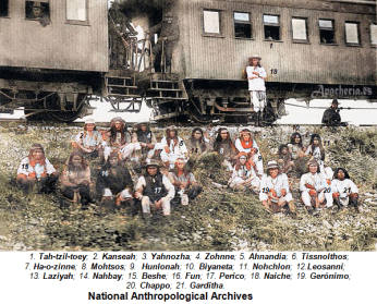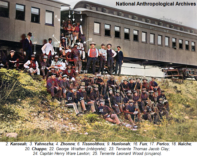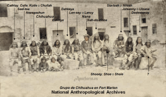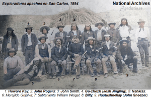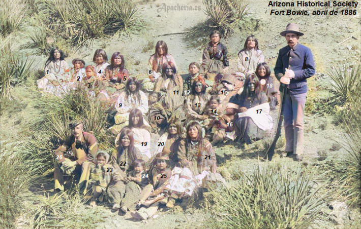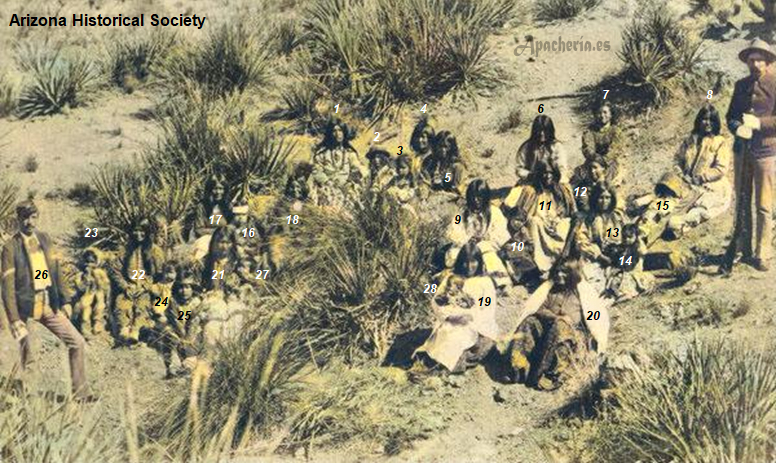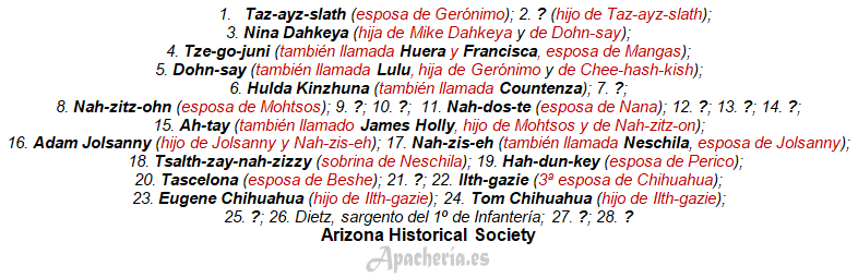 [también llamado Jesús]; Bailda [también llamado Forgetfulness o Forgetting]; Banyate [un apache mojave también llamado Henry Wilson] con su esposa; Boni Titla [también llamado Bread Maker]; Deze [también llamado Long]; Go-zhozh Josh Jingling]; William Skinatela; y las mujeres Dashpul [también llamada Butte]; Klezh-azh [también llamada Brushing Against]; Nazhinta; Searching y su bebé Little Skint Eyes; Net the Waites; y Woman Whipper; con otros dos hombres y tres mujeres sin identificar; y el intérprete mestizo James Stevens [hijo de George Harold Stevens [antiguo sheriff del condado de Graham y de Nahlindestowhe, también llamada Francisca, hija de Eskeltecela, jefe de la banda apache de los coyoteros White Mountain].