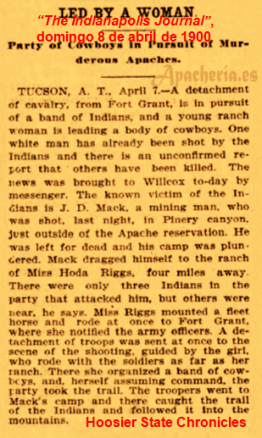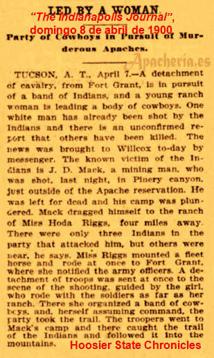(Marion County, Indiana) publica: “Dirigidos por una mujer. Grupo de vaqueros persiguen a asesinos apaches. Tucson, Territorio de Arizona. Un destacamento de caballería de Fort Grant [Graham County, Arizona] está persiguiendo a una banda de indios, y una joven mujer ranchera está dirigiendo a un grupo de vaqueros. Un hombre blanco ha sido tiroteado por los indios y hay un informe no confirmado que otros han resultado muertos. La noticia llegó a Willcox [Cochise County, Arizona] hoy por un mensajero. La víctima que se conoce de los indios es J. D. Mack, un minero, que fue tiroteado la última noche, en el Pinery Canyon [Cochise County, Arizona], justo en el límite exterior de la reserva apache. Fue dado por muerto y su campamento saqueado. Mack se arrastró hasta el rancho de la señorita Hoda Riggs a 6’4 km, de distancia. Dijo que solo había tres indios en el grupo que le atacó, pero que había otros cerca. La señorita Riggs montó un rápido caballo y cabalgó hasta Fort Grant, donde dio aviso a los oficiales del ejército. Un destacamento fue enviado a la escena del tiroteo, guiado por la muchacha, quien cabalgó con los soldados hasta su rancho, donde organizó un grupo de vaqueros, dirigidos por ella misma, para seguir todos, el rastro. Los soldados fueron al campamento de Mack donde encontraron el rastro de los indios, siguiéndolos hasta las montañas”.