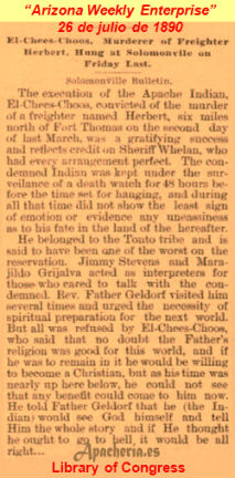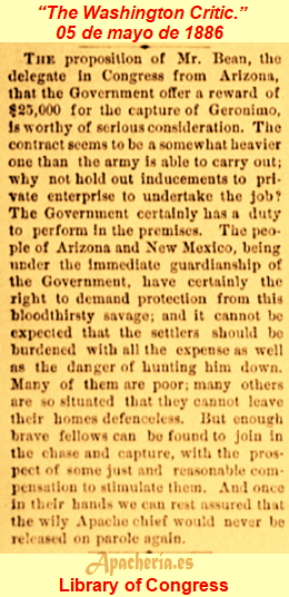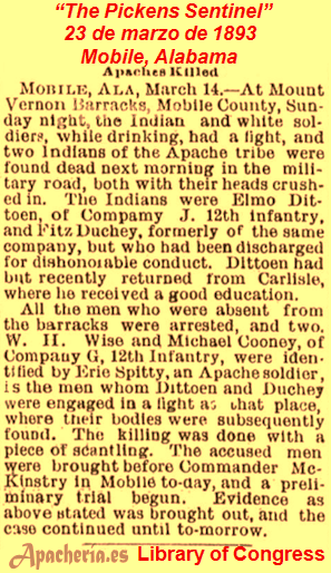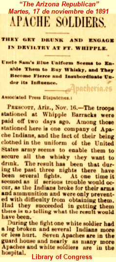 Los soldados de la reserva de San Carlos, donde la mayoría de los turbulentos apaches habían sido vigilados por varias compañías de militares durante años, han sido enviadas a servir en el Este, quedando solo nueve compañías de Caballería para vigilar a varios miles de apaches. Esta es probablemente la reserva desde la cual los apaches cruzaron la frontera hacia México. El agente ha hecho varias peticiones de refuerzos, afirmando que los indios estaban manifestando signos de inquietud, quejándose los colonos de la insuficiente protección que brindaban tan pocas tropas”.