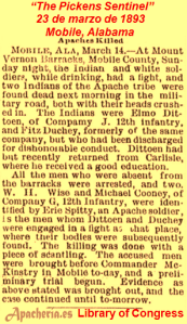 rumor salió de una muchacha apache, la hija de uno de los prisioneros, que había sido educada en la Escuela Industrial India de Carlisle [Cumberland County, Pennsylvania] y trabajaba de criada en el puesto. La muchacha había oído por casualidad una conversación en uno de los poblados que la llevó a creer que los apaches planeaban un levantamiento. No era así. La muchacha oyó decir en broma a algunos hombres, lo fácil que sería escapar ahora que los soldados se habían ido, pero los apaches ya no pensaban en ello, eso eran cosas del pasado. Ella había olvidado en parte la lengua apache, tras una larga estancia con los blancos, o no escuchó toda la conversación.