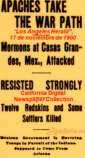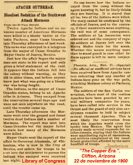 El periódico de Clifton [Greenlee County, Arizona], “The Copper Era.”, publicó el 22 de noviembre: “Estallido apache. Los pieles rojas más sangrientas del suroeste atacan a los mormones. Noticia tomada de ‘El Paso Herald’. Doce indios apaches y un desconocido número de mormones estadounidenses murieron en un sangriento enfrentamiento en Colonia Pacheco, cerca de Casas Grandes, en la tarde del jueves de la semana pasada. Esta noticia fue transmitida por telegrama del alcalde de Casas Grandes al alcalde Valentín Oñate de Ciudad Juárez [México].