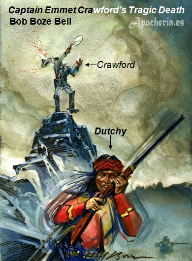 tales que no podía decir de dónde vino, pero sonaba como una sentencia de muerte y fue seguido por andanadas de ambos lados. Como todos buscamos cubierta, miré hacia atrás justo a tiempo para ver al jefe mexicano soltar su rifle y caer, con un tiro en el corazón. Otro mexicano, el teniente Juan de la Cruz, cayó mientras corría, atravesado por 13 balas. Los otros dos corrieron a protegerse tras un roble pequeño, pero casi fue cortado por las balas y ambos murieron. Otros nueve o diez que estaban a la vista rápidamente se echaron a tierra o se resguardaron en huecos tras las rocas, que era lo único que había cerca. Al llegar a las rocas donde había buscado refugio, me encontré con el capitán Crawford acostado con la cabeza perforada por una bala. Su cerebro le corría por la cara y parte de él yacía sobre las rocas. Debió haber recibido un disparo justo cuando llegó y subió a las rocas. Por encima de su rostro había un pañuelo rojo agarrado con su mano temblorosa. Dutchy estaba cerca de él. Le presté toda la atención posible en esas graves circunstancias. La caída del capitán Crawford fue un evento triste y desafortunado, muy de lamentar, que nos entristeció a todos, no pudiendo quitárnoslo de la cabeza”.