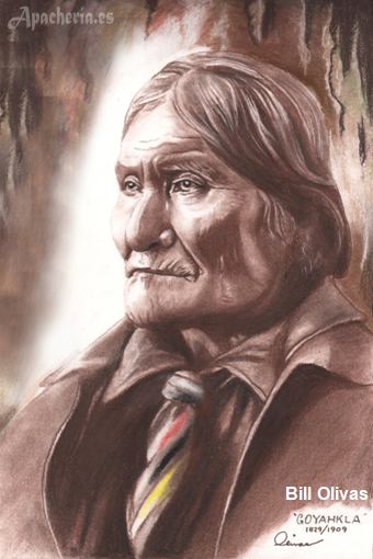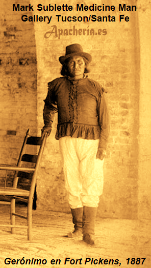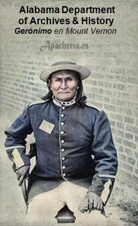 Alguien, con una errónea y exagerada información sobre Gerónimo, escribió a lápiz en el reverso de esta fotografía la siguiente nota: “Jefe Gerónimo de la Tribu Choctah. Una guardia de cuatro soldados asistiéndole para conseguir su imagen, vestido de civil y con el manto hecho delos cueros cabelludos humanos que había capturado, en el catre a su lado. Commanche [sic], Oklahoma, agosto de 1899”).