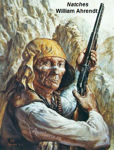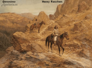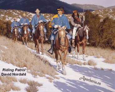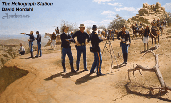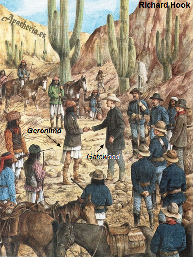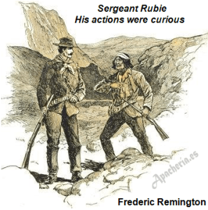 rocas pudimos ver las cabezas de muchos de nuestros scouts apaches con sus rifles listos, oyéndose el fuerte chasquido de las recámaras al insertar los cartuchos. También recuerdo la expresión de los rostros de los mexicanos al pensar que nuestros exploradores iban a disparar; de hecho, también me lo imaginaba yo. Al mismo tiempo me di cuenta de que un grupo de mexicanos iba de la parte baja de un barranco hacia un punto más alto en el que se dominaba y enfilaba nuestra posición, a unos 360 metros de distancia. Llamé la atención del capitán Crawford sobre ello, así como el aspecto de nuestros propios exploradores. Él dijo: ‘Por el amor de Dios, no dejes que abran fuego’. El comandante Corredor también dijo: ‘No tiréis, no abráis fuego’. Yo le dije que no dejara a sus hombres abrir fuego. Entonces me volví hacia los exploradores diciendo en español ‘No disparéis’ sosteniendo la palma de mi mano hacia ellos. Casi todos entienden español, aunque no todos lo hablan. Había dado unos pasos hacia adelante para llevar a cabo las instrucciones del capitán cuando un disparo resonó claro y solitario; los ecos eran