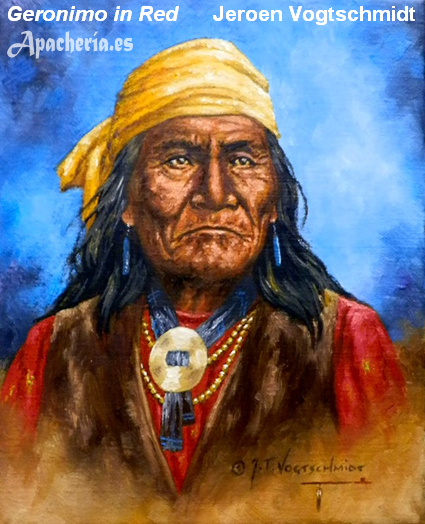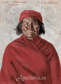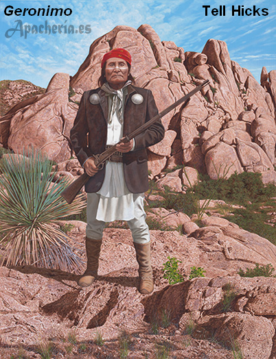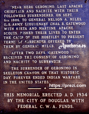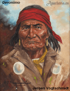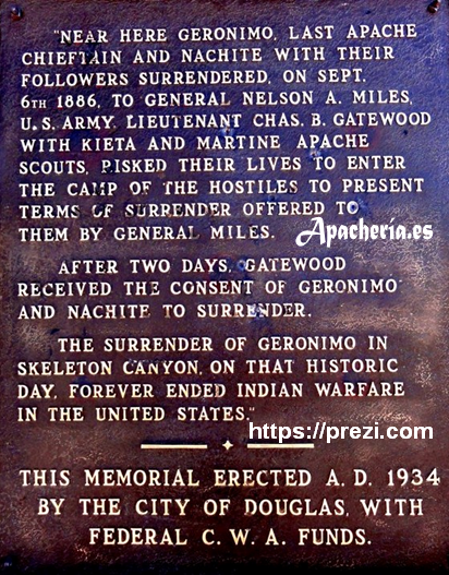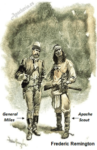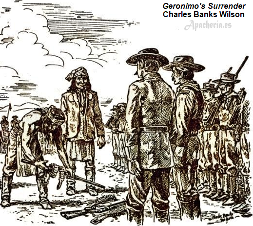 su rendición en 1886. El general, sonriendo abiertamente, admitió haber mentido, diciendo: “He aprendido a mentir de ti, Gerónimo. Tú mentiste a los mexicanos, a los estadounidenses y a tus mismos apaches durante 30 años. Los blancos te han mentido una sola vez, y fui yo quien lo hizo”. Gerónimo le pidió regresar a Arizona: “Las bellotas y los piñones, la codorniz y el pavo salvaje, el cactus gigante y el palo verde, todos me añoran… también yo los añoro a ellos. Quiero volver con ellos”. Cuando Stevens tradujo sus palabras, Miles sonrió de nuevo. “Un pensamiento muy bonito, Gerónimo; muy poético. Pero los hombres y mujeres que viven en Arizona, esos no te añoran… ahora, los habitantes de Arizona duermen por la noche y no temen que venga Gerónimo a matarlos. Las bellotas y los piñones, la codorniz y el pavo salvaje, el cactus gigante y el palo verde tendrán que arreglárselas como puedan sin ti”. Hay dudas de que la traducción de James Stevens fuese literal ante el odio, no disimulado, que sentía por el anciano apache. Cuesta creer que Miles, ante una gran audiencia, hubiese ridiculizado tanto a su antiguo enemigo, pero, sea como fuere, así ha llegado la historia.