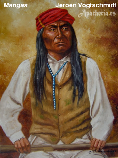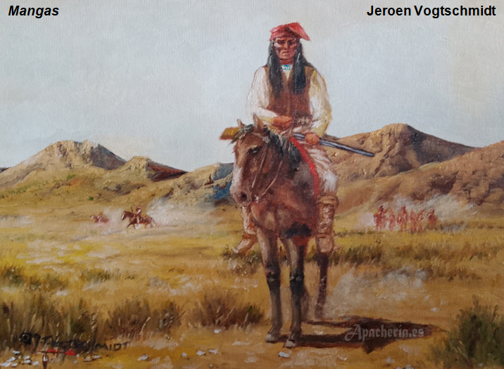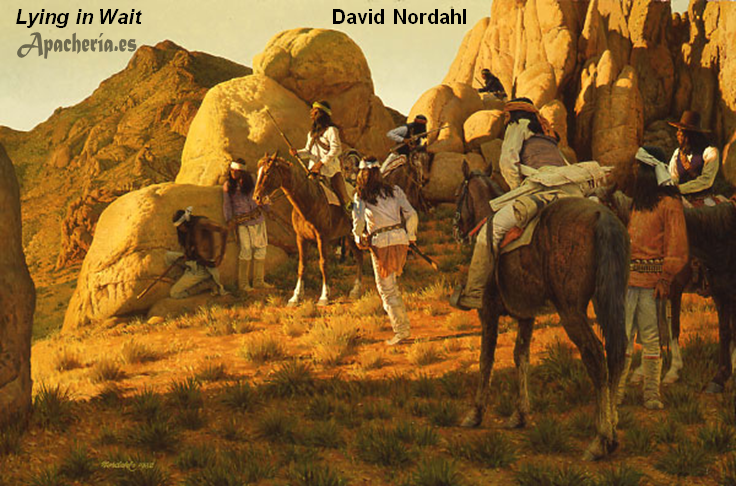 ladrar. (Harris tenía una granja cerca del asentamiento mormón de Colonia Pacheco [municipio de Casas Grandes, Chihuahua]. Algunas piedras cayeron con gran estrépito sobre el techo de la casa. Sospechando que era una trampa, no salió. Al amanecer vio que habían robado maíz y patatas de su huerto. Cogió una escopeta calibre 10, un morral lleno de cartuchos y fue en busca de su vecino, Thomas Allen, también mormón, quien también cogió su rifle. Siguieron las huellas de sus visitantes nocturnos hasta que subieron a un alto en cuya base había un campamento con un grupo de unos nueve apaches. Harris y Allen se escondieron a un lado del sendero sin pensar en atacarlos, pero los apaches subieron a sus caballos para dejar el campamento, yendo directamente al lugar donde estaban escondidos. Uno de los mormones hizo ruido, siendo descubierto por una mujer que iba delante, la cual avisó al hombre que iba detrás de ella. Parecía ser el jefe, llevando un gorro de guerra con plumas adornado con cuentas de plata y adornos alrededor de su muñeca y cuello.