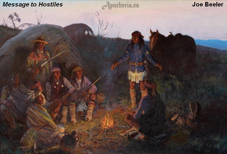 mujer apache diciendo que Gerónimo y Naiche estaban acampados junto al río Aros, a pocos kilómetros de distancia. Por lo que dijo la mujer, y por lo que Naiche dijo al explorador, parece que estaban considerando la posibilidad de rendirse y regresar a la reserva. Crawford envió a dos scouts a traer al grupo del cirujano Thomas B. Davis, porque con él estaba Concepción, el intérprete que hablaba apache y español. Después de dar a la mujer un poco de carne, Crawford accedió a reunirse con los jefes al día siguiente en una meseta a 1’5 km del campamento. Un explorador chiricahua, en compañía de otros cinco, fue enviado a vigilar a una colina al este del campamento, preocupándose cuando estos se quedaron dormidos, atribuyéndolo a algo sobrenatural. Con Gerónimo en las cercanías, estaba convencido de que el “hombre-medicina” [Gerónimo] había lanzado un hechizo para dormir en todo el mundo. Así que el explorador, que bien pudo haber sido Eskinzon [más