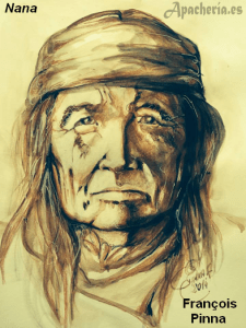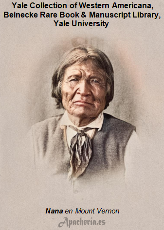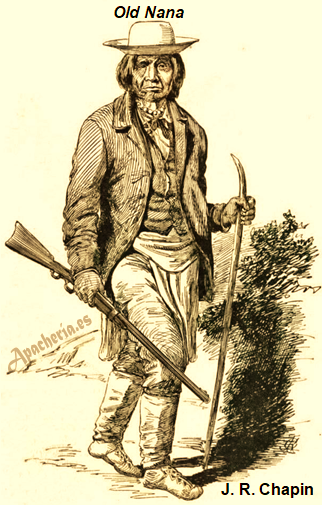 Horn en su libro “Life of Tom Horn. Government Scout and Interpreter” decía: “Cuando les perseguíamos vi a un renegado tratando de cruzar un pequeño canal de drenaje abierto a unos 90 metros de distancia, el cual iba cojeando […] Los dos estábamos corriendo y a no más de 22 metros de distancia le disparé. Entonces se paró en seco y se volvió hacia mí. Era el viejo Nana, cercano a los 90 años. Me dijo con tanta calma como si estuviera pidiendo sus raciones: ‘Me rindo‘. Luego empezó a hablar en español, lengua que hablaba con tanta fluidez como un mexicano”.