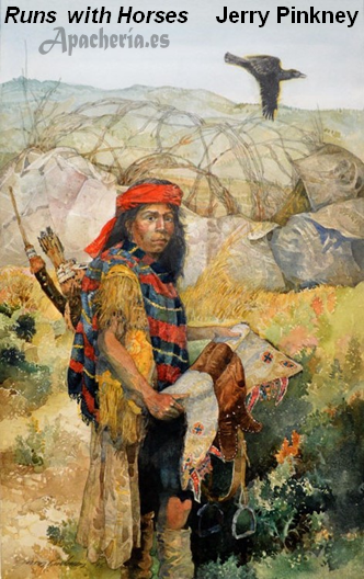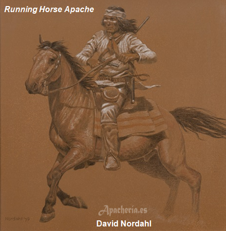 El dinero apostado en la carrera se ataba en un pañuelo y se dejaba en el suelo para que lo cogiera el ganador. Un joven blanco estaba montado en el caballo del hombre blanco. El muchacho apache cabalgaba a pelo y estaba firmemente unido al lomo del caballo como si fuera parte de él. Los caballos parecían igualados. Kiowas, comanches, apaches, soldados y ganaderos se reunieron a su alrededor. Por fin todo estuvo listo, y se dijo la palabra ‘adelante’. Los caballos partieron como el viento, ambos muchachos eran espléndidos jinetes. Pronto recorrieron el recorrido del cuarto de milla. Los espectadores, muy emocionados, vitorearon y gritaron, mientras el muchacho apache, cabalgando a un paso furioso, salió vencedor por medio cuerpo. La carrera puso fin a los emocionantes acontecimientos del día”.