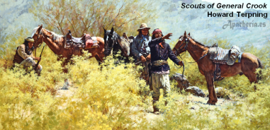 duro y tocino crudo. El médico, el Dr. Davis, estaba agotado y el intérprete Concepción por desgracia tampoco podía ir más lejos. Ya habían marchado de forma continua durante unas seis horas; estaban muy maltrechos y con los pies doloridos, incluso los scouts apaches mostraban el cansancio de la exigente marcha. Unos pocos se quedaron también, junto a los tres empaquetadores y las 11 mulas. Partieron Crawford, Maus, Shipp, el jefe de scouts William H. Harrison, el soldado sanitario Frank J. Nemick [de la compañía “G”, del 4º de Caballería], y unos 77 scouts, la mitad de ellos chiricahuas. Los militares llevaban mocasines para evitar hacer ruido.