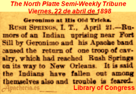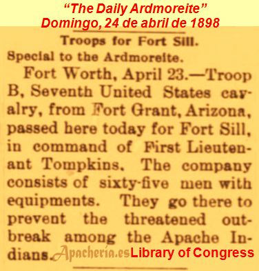 * El 25 de abril de 1898, Estados Unidos declara la guerra a España. (Todas las compañías militares partieron de Fort Sill [muchas unidades fueron movilizadas antes de declararse la guerra], excepto un destacamento de 20 hombres a las órdenes del teniente Beach. La última unidad que partió fue la compañía ‘E’ del capitán W. C. Brown, del 1º de Caballería, a las 14:00 horas del 18 de abril. Poco después, corrió el rumor de que los apaches iban a masacrar a las indefensas personas de Fort Sill. El