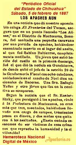 mulas entre Oputo y Huásabas, matando a cuatro hombres, Cipriano Velarde, Jesús María Durazo, Jesús Valencia y Francisco Laborin. Dos días más tarde, habían asaltado el rancho Capadeguachi, a unos 16 km al suroeste de Oputo. Soldados de Huásabas y Granados fueron en su ayuda ahuyentando a los apaches. A mediados de febrero, los incursores de Chihuahua y Jolsanny habían ido al oeste, hacia Cumpas, siendo por entonces 8 o 10 guerreros, ya que algunos de ellos fueron a incursionar con Naiche y Gerónimo. Cerca de Cumpas mataron a un estadounidense llamado Resse e hirieron a su compañero llamado Quirk. El 17 de febrero, asaltaron un rancho cerca de Cumpas matando a dos hombres, Luis Peralta y a otro estadounidense. La esposa de Peralta y su hijo permanecieron escondidos hasta que un destacamento del coronel Emilio Kosterlitzky les encontró. Más tarde, esa noche, los chiricahuas robaron ganado y una carreta de bueyes de un corral en el rancho de Salvador Hoyas [la carreta de bueyes sería vista más tarde en posesión de los exploradores, pudiendo haber sido comprada o ganada a los chiricahuas mediante apuestas]. La mañana del 18 de febrero, incursionaron en tres ranchos entre Cumpas y Nacozari. El primero de ellos era el Rancho Noria, donde robaron ganado e hirieron a un hombre, quien diría a Kosterlitzky que había oído disparos provenientes del Rancho Ventura [municipio de Cumpas, Sonora]. El coronel se dirigió al lugar, encontrando a Francisco Martínez inconsciente a causa de dos disparos. El rastro iba hacia el noreste, hacia el Rancho Alisos, donde robaron más ganado. Con unos 100 caballos, mulas y reses, se fueron al norte, y de camino mataron a dos estadounidenses, William Brown y James Moses.