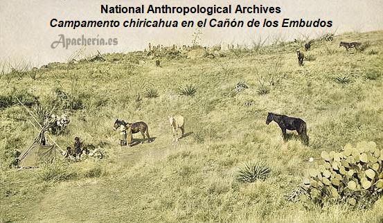 con 22 guerreros y un gran rebaño de ganado robado. Chihuahua y siete de sus seguidores se quedaron por los alrededores. Mangas no tenía intención de acudir. Gerónimo y Naiche mantuvieron varias conversaciones con el teniente Maus al día siguiente, quien les pidió que se acercaran a la frontera, a lo que se negaron, declarando que Crook podía reunirse con ellos ahí mismo. Advertidos repetidamente de la posibilidad de un ataque mexicano, accedieron tres días más tarde, el 22 de marzo, a acercarse a la frontera para evitar a las tropas mexicanas. Quedaron en un pequeño barranco llamado Cañón de los Embudos, a 40 km al sur de la frontera.