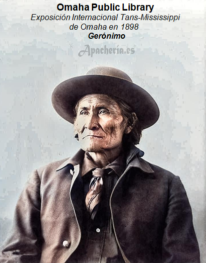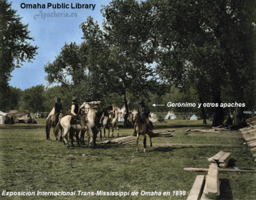 niños, viajan bajo custodia, supervisada por el teniente Francis H. Beach, desde Fort Sill al “Congreso Indio” en el marco de la “Exposición Internacional Trans-Mississippi” en Omaha ([Douglas County, Nebraska]. Durante el trayecto, cuando el tren se detenía en las estaciones, Gerónimo quitaba los botones de su chaqueta para venderlos por 25 centavos y su sombrero por 5 $. Antes de llegar a otra estación, cosía otros botones y sacaba otro sombrero, que llevaba en cantidad para la ocasión.