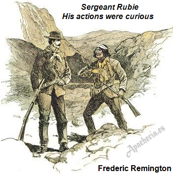 especialmente cuando se trataba de su bienestar. En un lugar del camino, Maus se alejó del destacamento para ir a cazar. No había ido muy lejos cuando vio al sargento Ruby, quien estaba siguiendo las instrucciones de su suegro [Loco] al pie de la letra. Ya que se habían descubierto huellas de los chiricahuas en las cercanías, indicó a Maus que volviera al campamento. Este diría de los exploradores: “Nada escapa a sus vigilantes ojos mientras marchan silenciosamente sobre sus mocasines… Su sistema de avanzadilla y de flanqueo era perfecto”.