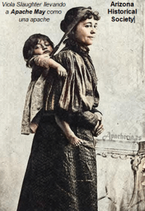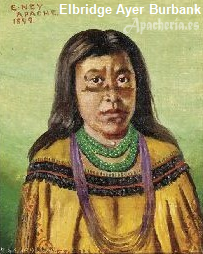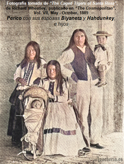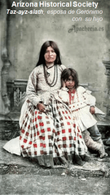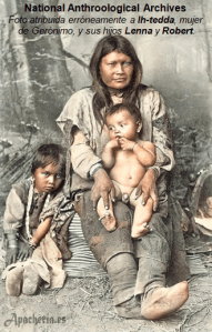 única respuesta que yo le podía dar y que era sincera. Luego se levantó, se acercó a mí y me dio la mano, diciendo que confiaba en mí y luego me pidió que informara al comandante del departamento de lo que tenía que decirle. Enumeró sus quejas sobre la Agencia, las cuales eran puramente imaginarias o supuestas. Le aconsejé que se rindiera y le dije que si no lo hacía, las tropas de los Estados Unidos y los mexicanos no le dejarían descansar. Estuvo de acuerdo en rendirse, comprometiéndose a reunirse con el general Crook cerca del río San Bernardino [Sonora] en el plazo de dos meses para entablar negociaciones sobre la rendición. Gerónimo envió [al día siguiente, 16 de enero] a nueve personas, incluyendo a un guerrero; a Nana y su esposa Nah-dos-te [hermana de Gerónimo]; una de las esposas de Naiche y su hijo; Ih-tedda [embarazada de Lenna], una de las esposas de Gerónimo y una de las hijas de este. [La fotografía de la supuesta Ih-tedda fue realizada por A. Frank Randall en 1886, cuando todavía no habían nacido Lenna y Robert. Robert Geronimo nació el 2 de agosto de 1889 en Alabama. Randall hizo varias fotografías de la misma mujer, en las cuales aparece escrito a mano: ‘Mescalero Apache e hijos’ o ‘Mescalero Apache madre e hijo’]. Con este acuerdo regresé al campamento. Al poco tiempo envió a unos prisioneros con la petición de que yo les diese un poco de azúcar y harina. Accedí habiendo enviado mientras tanto a algunos de mis exploradores a donde estaba la recua de