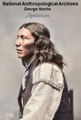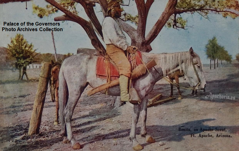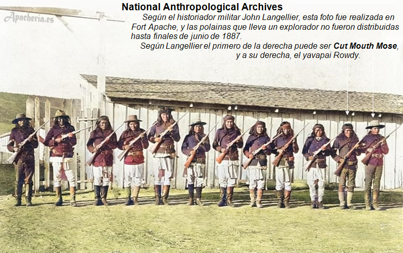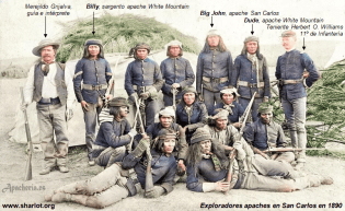 alrededor de un año, me retiré al llegar a San Carlos y estuve fuera durante más de un año, pero me alisté nuevamente durante la huida de Gerónimo en 1885 y fui a las montañas de la Sierra Madre de México con 100 exploradores, bajo el mando del capitán Dorst, del 4º de Caballería. El capitán Crawford iba por delante de nosotros con 100 exploradores White Mountain. Me enviaron a los puntos de alta montaña con 15 exploradores para tratar de localizar a los hostiles. Era invierno y hacía un frío intenso; con frecuencia teníamos carámbanos colgando de nuestro cabello. Mientras cumplíamos con nuestro deber, nos enteramos de que el capitán Crawford había resultado muerto por tropas mexicanas y, en aproximadamente una semana, su destacamento, ahora bajo el mando del teniente Maus, se unió a nosotros, y como nuestro alistamiento se estaba acabando, nos llevaron a San Carlos y nos licenciaron. Debido al duro servicio que habíamos sufrido, nuestra ropa estaba hecha jirones y nuestros mocasines gastados.