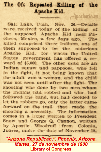 la Iglesia mormona, quien llegó aquí acompañado por Abraham Owen Woodruff y el Dr. Seymour, después de una gira entre las colonias en México, informa de la muerte del famoso Apache Kid durante la reciente incursión india en Colonia Pacheco…”.