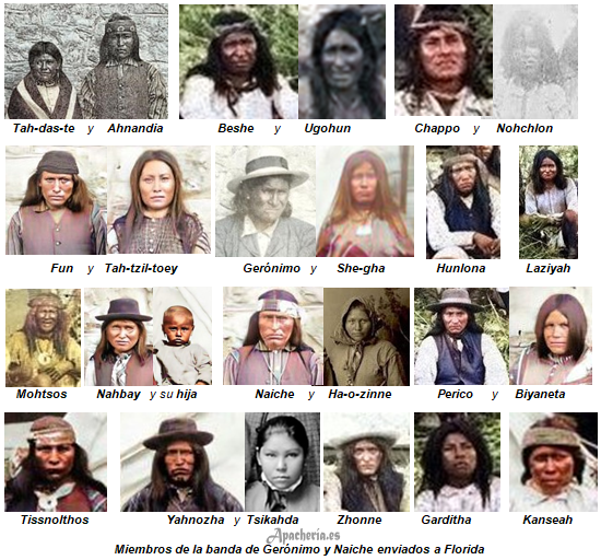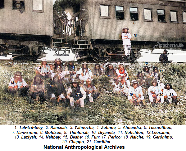 su esposa Ha-o-zinne y sus hijos, Amelia Naiche [hija de Ha-o-zinne] y Jane Naiche [hija de su 2ª esposa E-clah-heh]; Tom Chiricahua con su esposa Coshey y su hija Hattie Tom; Toclanny y su mujer Syekonne [también llamada Siki, Tsa-Kan-e y Tse-kan] con su bebé, Jenny Toclanny; John Loco y su mujer Marion Juan o Naizha; Leonard Kanesewah; Sam Haozous; Frank Mangas; Perico; Yahnozha; y las mujeres Banatsi y Tahdaste.
