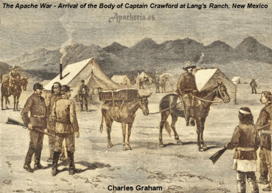 a la cara y luego me apretó la mano. Sin duda, estaba consciente y traté de hacerle hablar o escribir, pero no pudo. Le aseguré que haría todo lo que estuviese en mi mano para arreglar sus asuntos. Puso su brazo alrededor de mí y me atrajo hacia él, pero solo podía mover la cabeza como respuesta. Este intervalo consciente solo duró unos 5 minutos y luego la mirada inteligente pareció desaparecer para siempre. Al día siguiente murió mientras estábamos marchando, falleciendo en silencio, no sabiendo nadie la hora exacta de su muerte. Envolvimos su cuerpo en la lona y lo colocamos en una de las mulas de carga. Ahora avanzábamos más rápidamente, pero cuando llegamos al río Satachi no podíamos cruzarlo, ya que estaba desbordado por las lluvias tardías y era profundo y turbulento. Por tanto, nos vimos obligados a ir al campamento y perder un día. Mientras tanto, el cuerpo del capitán Crawford comenzó a descomponerse, por lo que nos apresuramos, cruzamos el río al día siguiente y al otro llegamos a Nácori [el 22 de enero]. Aquí enterramos al capitán Crawford, poniendo su cuerpo a cargo del alcalde de la localidad y marcando bien el lugar de su sepultura. Solo pude conseguir cuatro tableros en la población y los utilizamos en la fabricación de un ataúd con el cuerpo envuelto en la lona. [Dos meses más tarde, E. C. Bunker, un empaquetador civil, fue enviado, junto a un enterrador, a recuperar el cuerpo. Lo desenterraron y lo transportaron sobre una mula durante un viaje de 320 km hasta la estación de Bowie {Cochise County, Arizona}].
