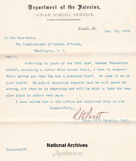 de la Escuela India de Carlisle (Cumberland County, Pennsylvania), escribe al Comisionado de Asuntos Indios en Washington, D. C., para informarle de la enfermedad del corazón que sufre el chiricahua Sam Kenoi.