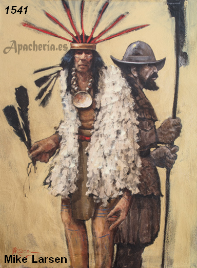 alentar a los querechos a establecerse cerca como aliados contra un posible retorno de los españoles. Exploraciones posteriores encontraron querechos en las montañas que rodean tanto el Ácoma [Acoma Pueblo, Cibola County, New Mexico] como la zona de los hopi [otros nativos Pueblo del noreste de Arizona] pero es más probable que fuesen apaches occidentales [que más tarde serían denominados Western Apaches o chiricahuas] que llegaron desde el oeste en vez de apaches orientales llegados de las llanuras. Juan de Oñate, colonizador de Nuevo México en el siglo siguiente, informó de la hostilidad existente entre bandas de querechos e nativos Pueblo, pero también observó un importante comercio entre ellos. Hay historiadores que indican que parte de los nativos Pueblo utilizaron a bandas de querechos como aliados o mercenarios para atacar y saquear a otros nativos Pueblo).