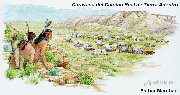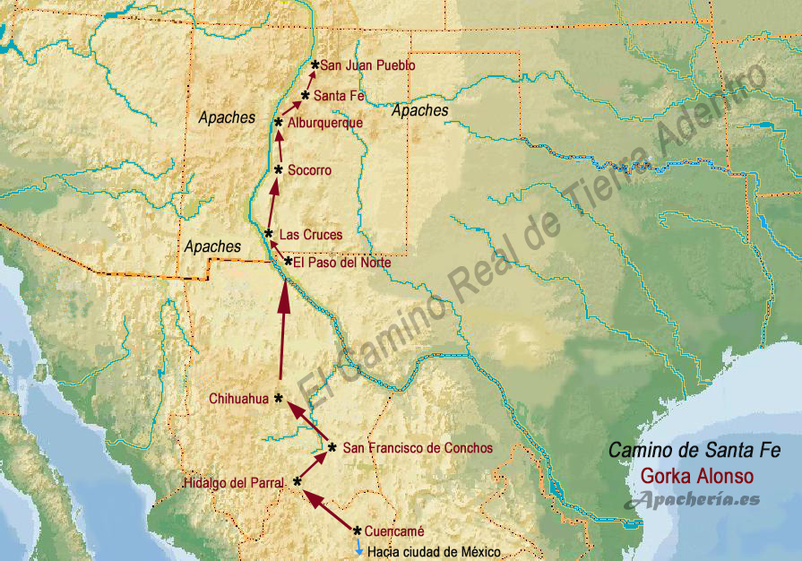 conocido como “Camino de Santa Fe” o “Camino de la Plata”. (Fue el más importante de los Caminos Reales y unía la ciudad de México y Santa Fe [Santa Fe County, New Mexico]. Era una ruta comercial de 2.560 km que se hacía cada tres años con carretas tiradas por bueyes en las que iban frailes, familias y soldados de escolta transportando plantas, semillas, muebles, enseres, papel, tinta y numerosas cabezas de ganado… todo lo que necesitaban los nuevos colonos para instalarse en aquellos peligrosos territorios fronterizos. El viaje duraba seis meses atravesando regiones habitadas por nativos).