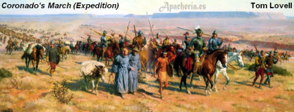 al “turco” como guía. Atravesó el Llano Estacado [este de New Mexico y noroeste de Texas] y llegó a las praderas del “Medio Oeste”, prosiguiendo su marcha hacia el norte, donde se encontró con los nativos vaqueros o querechos [apaches]. Pedro de Castañeda, cronista de la expedición, indicó que los querechos se comunicaban con los españoles por signos, de tal manera que “hicieron hacerse entender tan bien que no había necesidad de un intérprete”. Los querechos mostraron gran conocimiento del este del territorio, describiendo un gran río que bien podía ser el Mississippi. Castañeda señaló que eran “gente amable y nada cruel, y eran amigos fieles”. Los primeros encuentros entre los españoles y los querechos [apaches] fueron bastante cordiales.