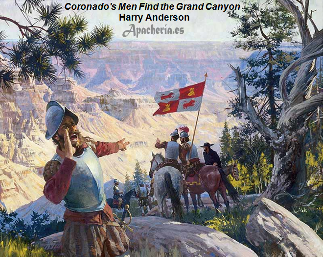la verdadera dimensión de la hondonada, y el caudal del río, que era para ellos “como el río Gualdalquivir”. Fracasaron en su intento, regresando sin poder beber, asombrados por la profundidad de la sima que el río había hecho en el lugar. Habían encontrado el Cañón del Colorado [noroeste de Arizona]. El capitán Hernando de Alvarado fue hacia el este con un nativo con mostacho al que apodaron “Bigotes”,