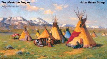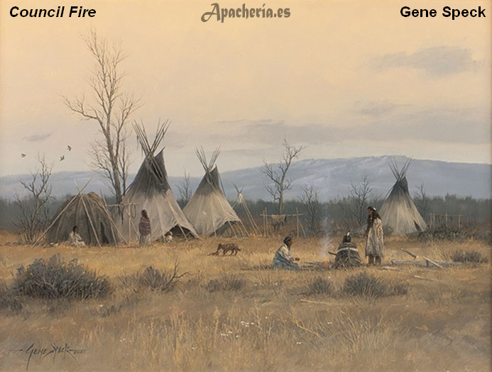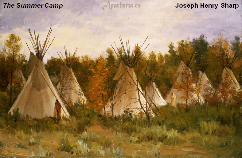 una ranchería con 50 tipis, rojas y blancas, curtidas a la perfección. Tras esa visita, el informe añade una descripción muy detallada de los apaches de las llanuras y dice que las mujeres son responsables de la formación y el cuidado de los perros.