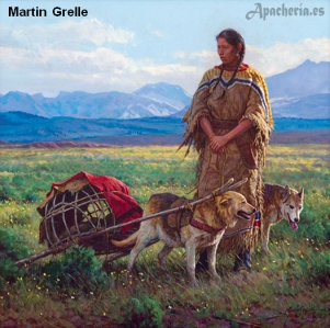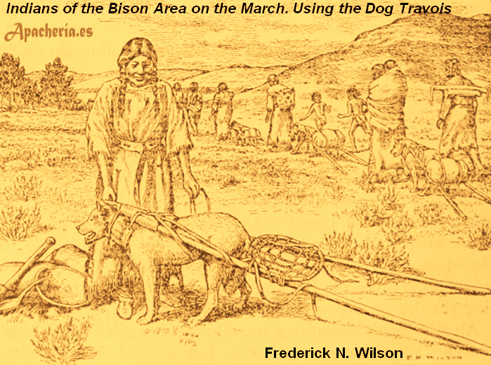 campamento, se topó con una ranchería de 50 tiendas hechas de pieles curtidas que eran muy brillantes, de color rojo y de color blanco… redondas como pabellones, con alas y aberturas, y hechas tan bien como las de Italia. Son tan grandes que en las más comunes hay un amplio espacio para cuatro colchones y camas individuales. El curtido es tan bueno que incluso las lluvias más fuertes no pasarán por la piel, ni se endurece… cuando se seca se vuelve tan suave y flexible como antes… el sargento mayor cambió una por una tienda de campaña y se la llevó al campamento… Para llevar esas tiendas, los postes con que se levantan, una bolsa de carne y su pinole, o el maíz, los indios usan perros de tamaño mediano, como si fuesen mulas. Tienen gran cantidad de ellos, cada uno con correas de amarre alrededor del pecho y patas, llevando una carga de, al menos, 100 libras [45’ 359 kg]…”.