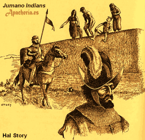 Humaña, huyendo con seis nativos. Murieron todos menos uno, un nativo náhuatl llamado Jusepe Gutiérrez, que permaneció prisionero de los apaches durante un año. Teniendo noticias de que había españoles al este [la vanguardia en Nuevo México de Juan de Oñate] se escapó encontrándose con las tropas españolas, ofreciéndose como guía e intérprete. El resto de los expedicionarios previsiblemente fallecieron a manos de los nativos de las praderas. La columna de Juan de Oñate encontró bandas de apaches de las llanuras, o vaqueros [Vázquez de Coronado les había denominado originalmente “pueblo de las vacas”] recorriendo las vastas praderas en busca de bisontes, llevando sus escasas pertenencias por medio de perros. Demostraron ser suficientemente sociables, incluso un poco tímidos, excepto uno de ellos que intentó asustar a los españoles, apareciendo en medio de ellos vestido con un traje rojo con cola y una máscara de la que sobresalía un largo hocico y orejas caídas. Los soldados, agradecidos por la representación, fingieron terror, cuando el nativo hizo gestos amenazantes. Luego se quitó la máscara y rompió a carcajadas. Otro día conocieron a un jefe apache