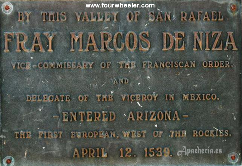 motivo de sus exageraciones] de que había ciudades más grandes y más suntuosas que Tenochtitlán [capital azteca], edificios de piedra de hasta 10 plantas de altura, templos con fachadas cubiertas por turquesas y, por supuesto, oro en grandes cantidades. Los informes del fraile coincidían perfectamente con lo que Mendoza quería oír, por lo que se puso a organizar una expedición por todo lo alto. Dio la jefatura de la misma a Francisco Vázquez de Coronado. La placa recuerda al primer europeo que recorrió lo que, posteriormente, sería llamado Arizona).