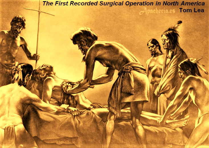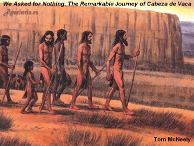 de Carranza, Alonso del Castillo Maldonado y Estebanico [nacido en Sevilla pero hijo de esclavos negros] y juntos reanudaron el camino. Cuando Cabeza de Vaca extrajo con éxito otra punta de flecha a un nativo, la fama de curandero aumentó. Se ganaron la voluntad de los nativos e hicieron varias exploraciones en busca de una ruta para regresar a la Nueva España, por lo que hoy es el suroeste de los Estados Unidos y el norte de México. Tras deambular durante largo tiempo por la extensa zona de lo que hoy es la frontera entre los dos países, llegaron a la zona del Río Bravo, donde, siguiendo el curso del río, encontraron tribus dedicadas a la caza del búfalo con las que convivieron y a las que llamaron “gente de las vacas” [por ser cazadores de bisontes], y que años después, Francisco Vázquez de Coronado, llamaría querechos, que significa comedores de bisontes, o vaqueros [apaches].