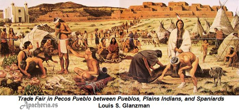 sus desplazamientos hacia las inmediaciones del Río Grande, limitando su comercio a los pueblos fronterizos, especialmente Pecos Pueblo [San Miguel County, New Mexico] y Las Humañas (hoy, Gran Quivira, Torrance County, New Mexico), aunque los comerciantes españoles les iban a buscar a las llanuras. A pesar de disminuir el contacto, los españoles continuaron cogiendo cautivos, algunos de ellos, de los que se acercaban a los asentamientos fronterizos para