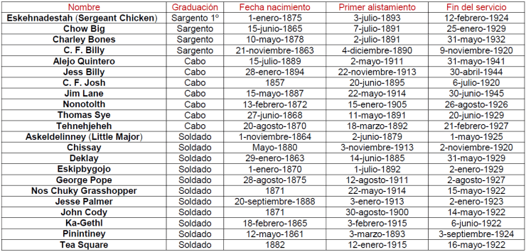 aparecen nueve prisioneros apaches sirviendo como exploradores en Fort Sill (Comanche County, Oklahoma) bajo el mando del capitán Farrand Sayre, del 8º de Caballería. (Los apaches eran Christian Naiche, Talbot Gooday, John Loco, Leon Perico, Alfred Chato, Allen Yuzos, James Kawaykla, Jason Betzinez y Asa Daklugie.