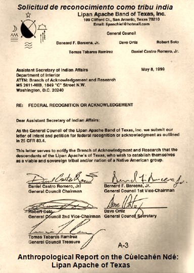 * El 8 de mayo de 1999, la “Lipan Apache Band of Texas”, presenta una carta a la