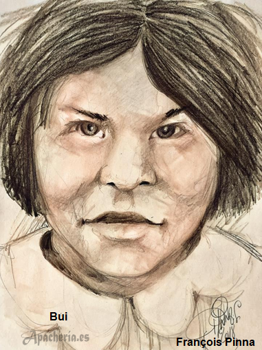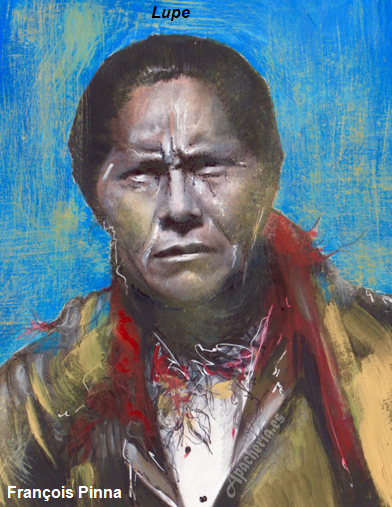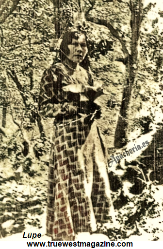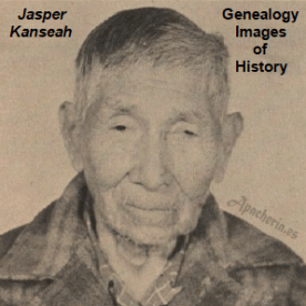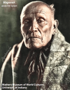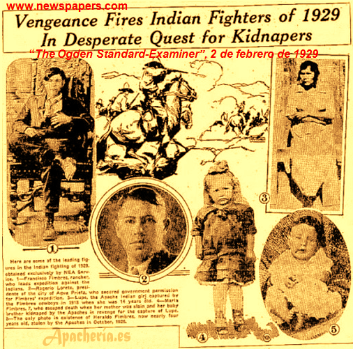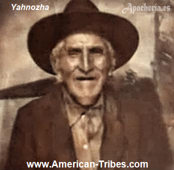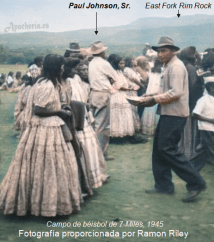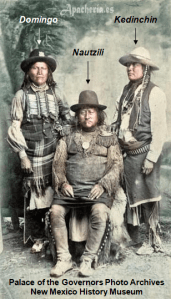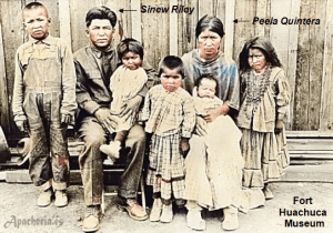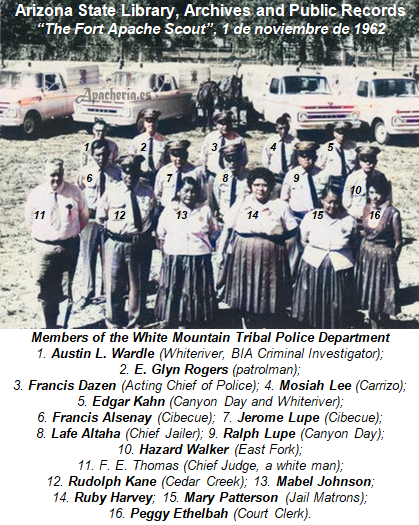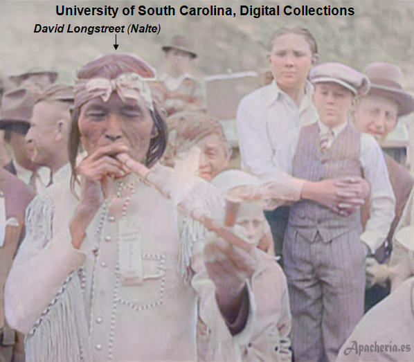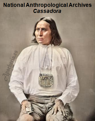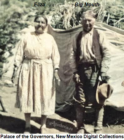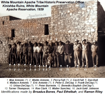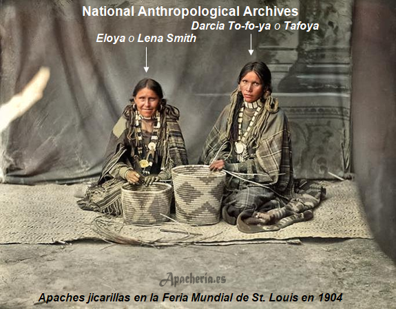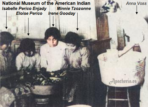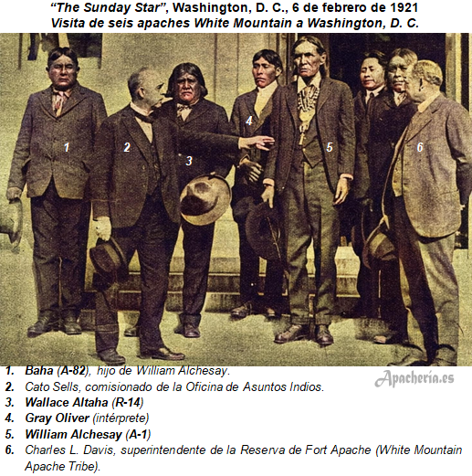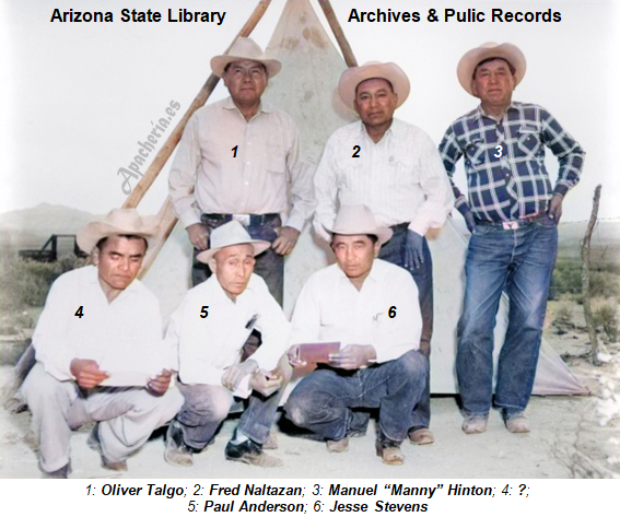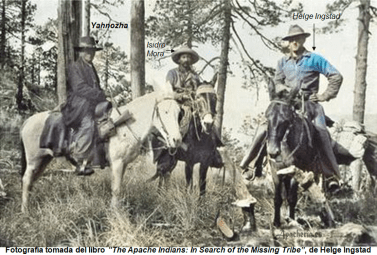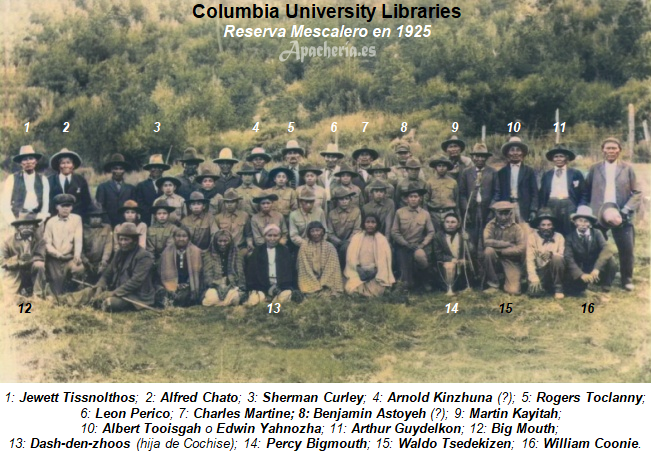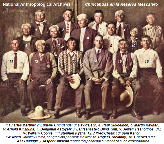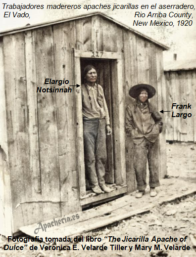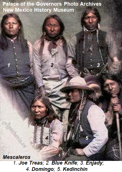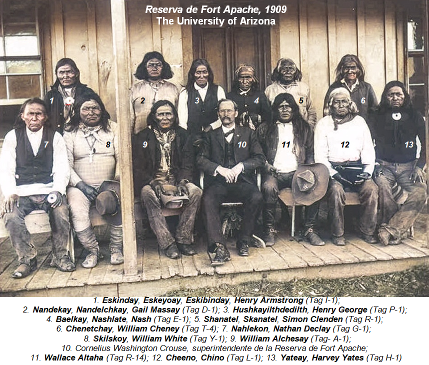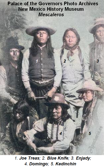 proveniente de la reserva apache jicarilla [Rio Arriba y Sandoval Counties, New Mexico], formada por el jefe Diloya Tagoya, Raman Tafoya, el joven Deloya Tafoya, Christian Vasalta, Lamonta Trovlezeter, Christin Pisente de 39 años, Lassar, y las mujeres Darcia Tafoya, Eloya [también llamada Lena Smith], y Truata Trovlezeter.