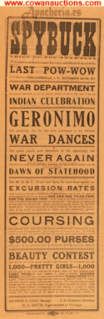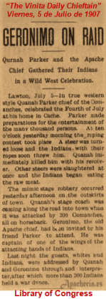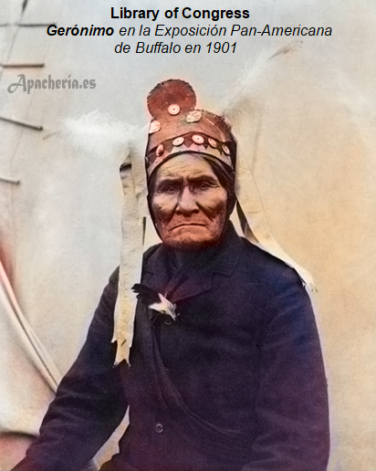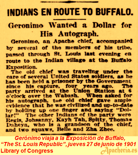County, Missouri), publica la noticia del viaje de Gerónimo y otros apaches al Congreso Indio de la “Exposición Pan-Americana”, celebrada en Buffalo ([Erie County, New York]. También fueron Nube Roja, jefe sioux oglala; Jefe Joseph, jefe nez percé; y otros jefes indios. Gerónimo tuvo permiso para elegir a los apaches que iban a ir con él: su nieto de 11 años, Thomas Dahkeya [hijo de Dahkeya y Dohn-say]; Regis Alchintoyah; Jolsanny [también llamado Ulzana]; Martin Kayitah; Erick Spitty y su mujer Clara Belle Spitty; y Zha-an-zhe [hija de Bish-to-yey]. La paga de Gerónimo en Buffalo era de 45 $ al mes. Aquí no llamó demasiado la atención porque los periódicos dedicaban sus portadas a la noticia de la subasta, el 6 de agosto, de tierras en Oklahoma pertenecientes a kiowas, Kiowa-Apaches y comanches para ser adquiridas por colonos blancos, quienes llegaban de todas partes de los Estados Unidos para participar en la subasta.