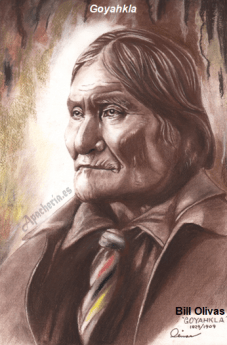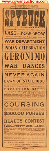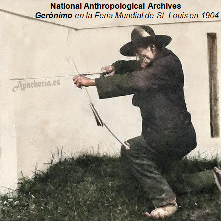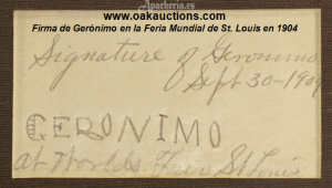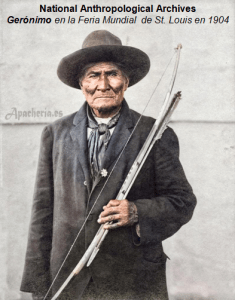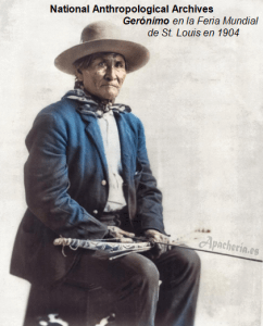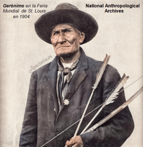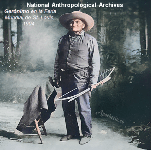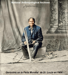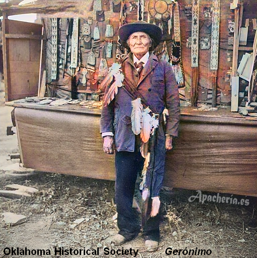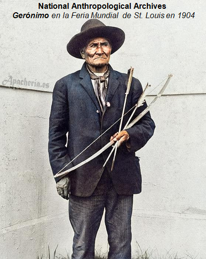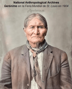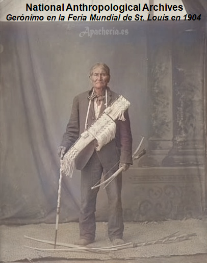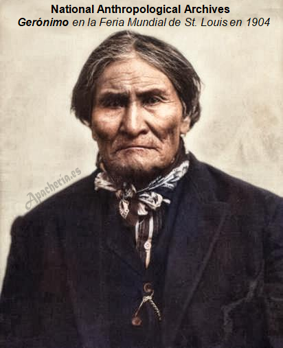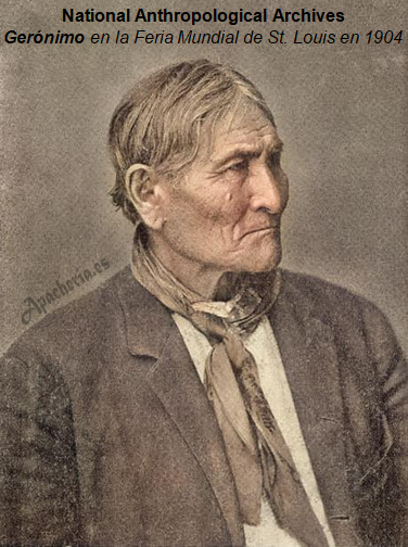 Cuando me invitaron a asistir a la Feria Mundial de St. Louis, dije que no. Pero luego me dijeron que estaría bien atendido y protegido, y que el presidente de los Estados Unidos estaba de acuerdo; entonces acepté”. [Unos funcionarios del ayuntamiento de Lawton [Comanche County, Oklahoma] instaron a que Gerónimo estuviera presente: “… como saben ustedes, tiene entre 85 y 100 cabelleras de blancos… e incluso un chaleco hecho con el pelo de los blancos que ha matado”. Gerónimo tenía su propio stand, junto al de los nativos Pueblo].